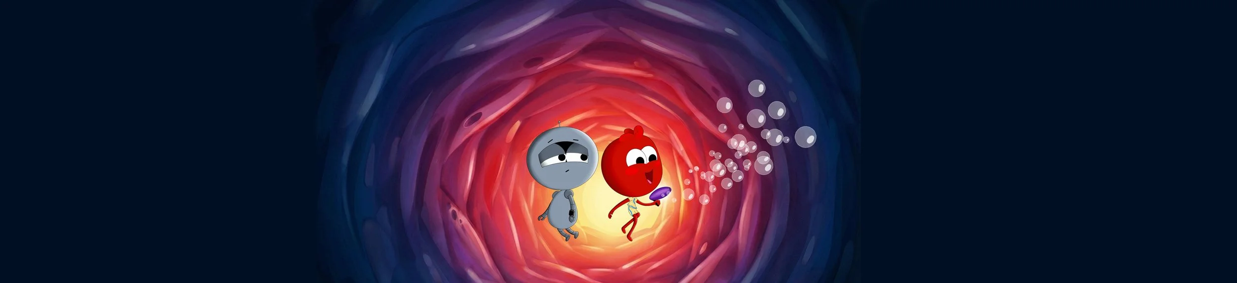 Glitches take over Robot’s functions, drain his power and force Robot to work. Robot navigates the bloodstream alongside a cheerful, relentlessly optimistic red blood cell named Red. Red has a habit of making friends with anyone, no matter what kind of cell they are. He is fascinated by the world around him and sees beauty in the very things that make Robot gag.